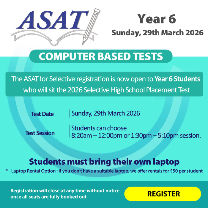 Don't forget to mark your calendars! The 37th ASAT will take place on Sunday, 29th March 2026. This is a fantastic chance for Year 6 students to gear up for the 2026 Selective School Placement T... Read More30-Jan-2026 | 8:14 PM