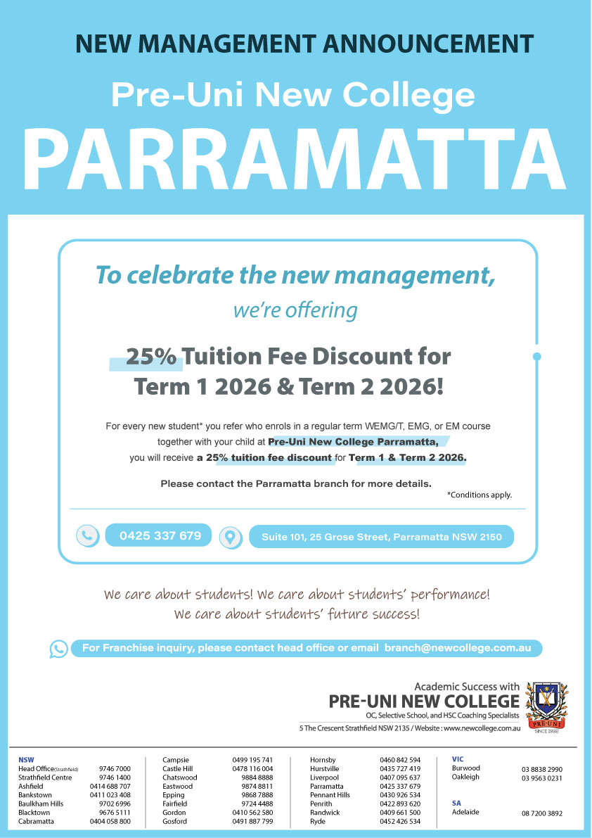 We are pleased to announce that the Pre-Uni New College Parramatta branch is now under new management, aimed at providing an even greater learning experience for our students and parents. This transition reflects our ongoing commitment to delivering high-quality education that is both accessible and supportive for local families. Under the new management, the Parramatta branch will continue to be led by a team of experienced and dedicated educators who are passionate about nurturing your child’s academic and personal growth.