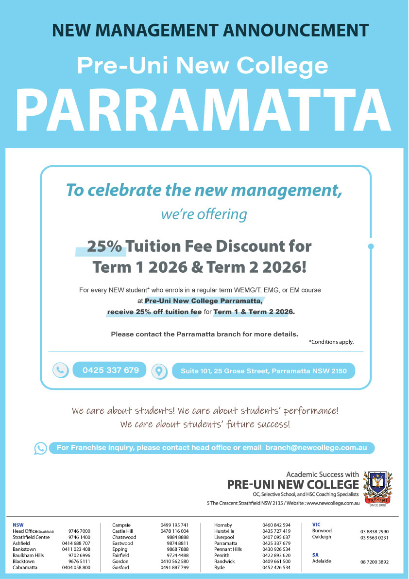 We are pleased to announce that the Pre-Uni New College Parramatta branch is now under new management, aimed at providing an even greater learning experience for our students and parents. This transition reflects our ongoing commitment to delivering high-quality education that is both accessible and supportive for local families. Under the new management, the Parramatta branch will continue to be led by a team of experienced and dedicated educators who are passionate about nurturing your child’s academic and personal growth.