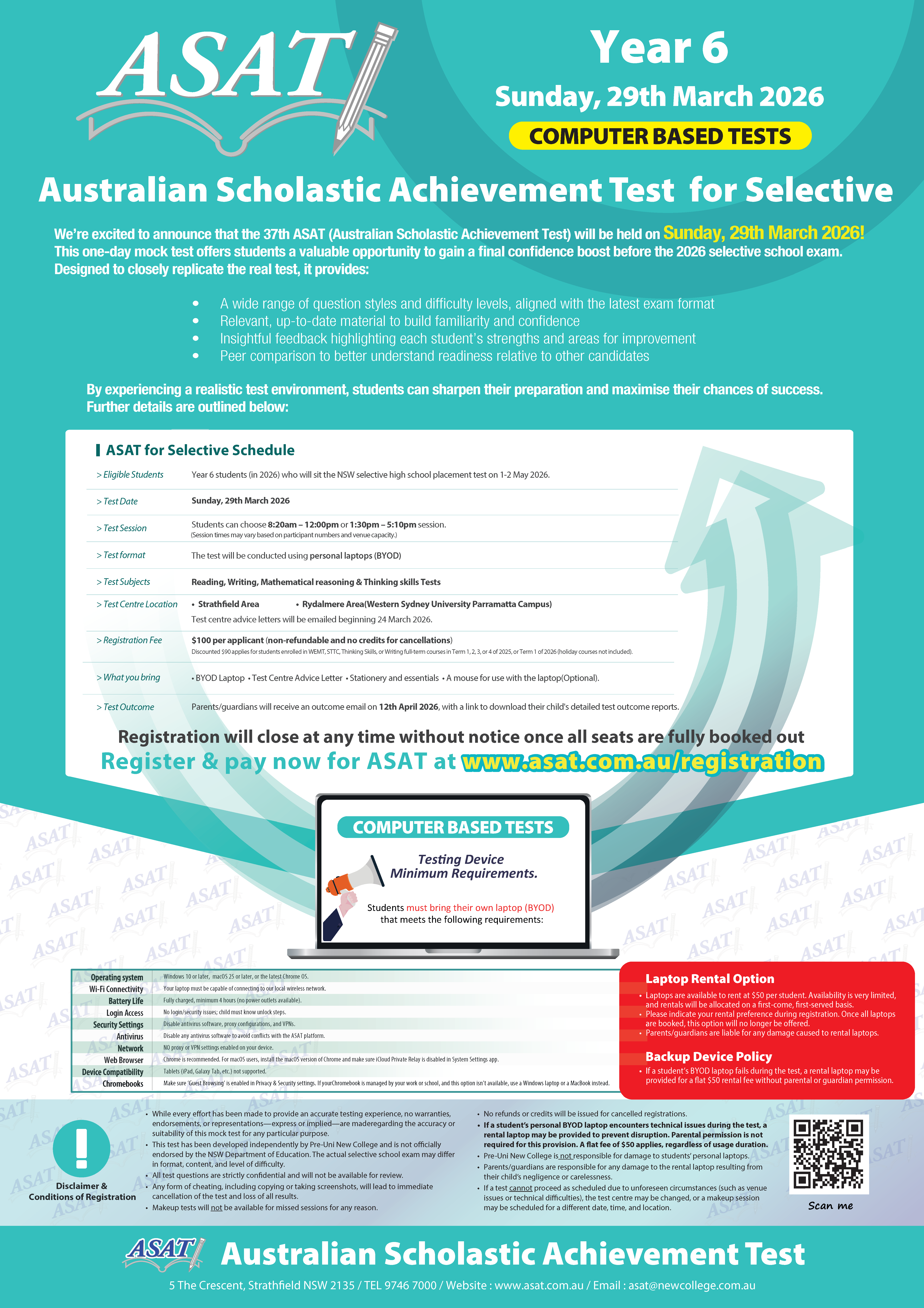 Don't forget to mark your calendars! The 37th ASAT will take place on Sunday, 29th March 2026. This is a fantastic chance for Year 6 students to gear up for the 2026 Selective School Placement Test. Seize the opportunity—register now to gain crucial insights into your strengths and positioning! For more information, check out the newsletter link below.